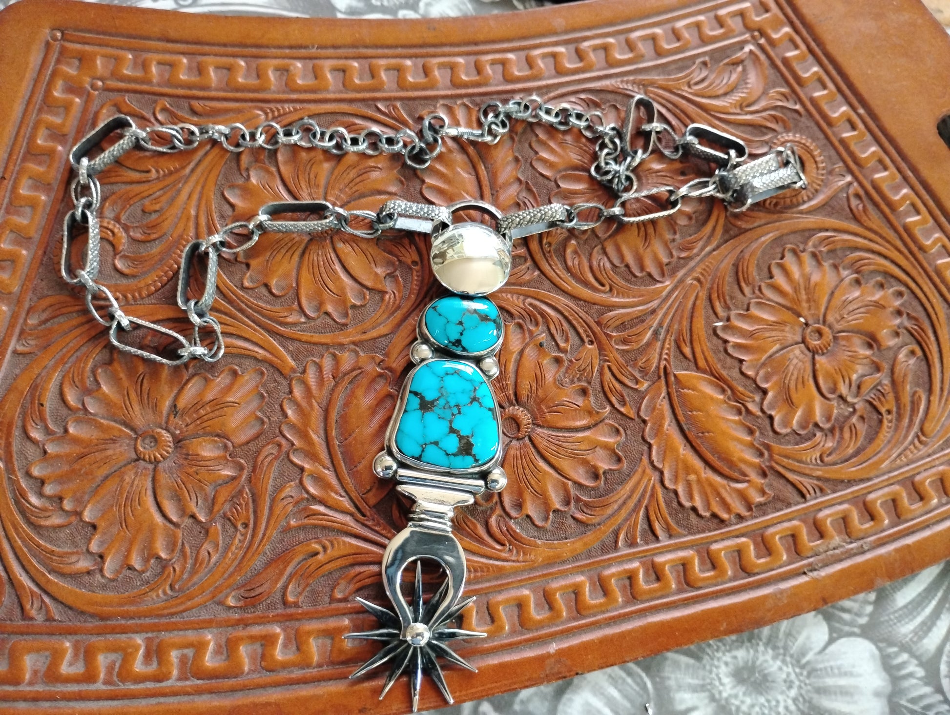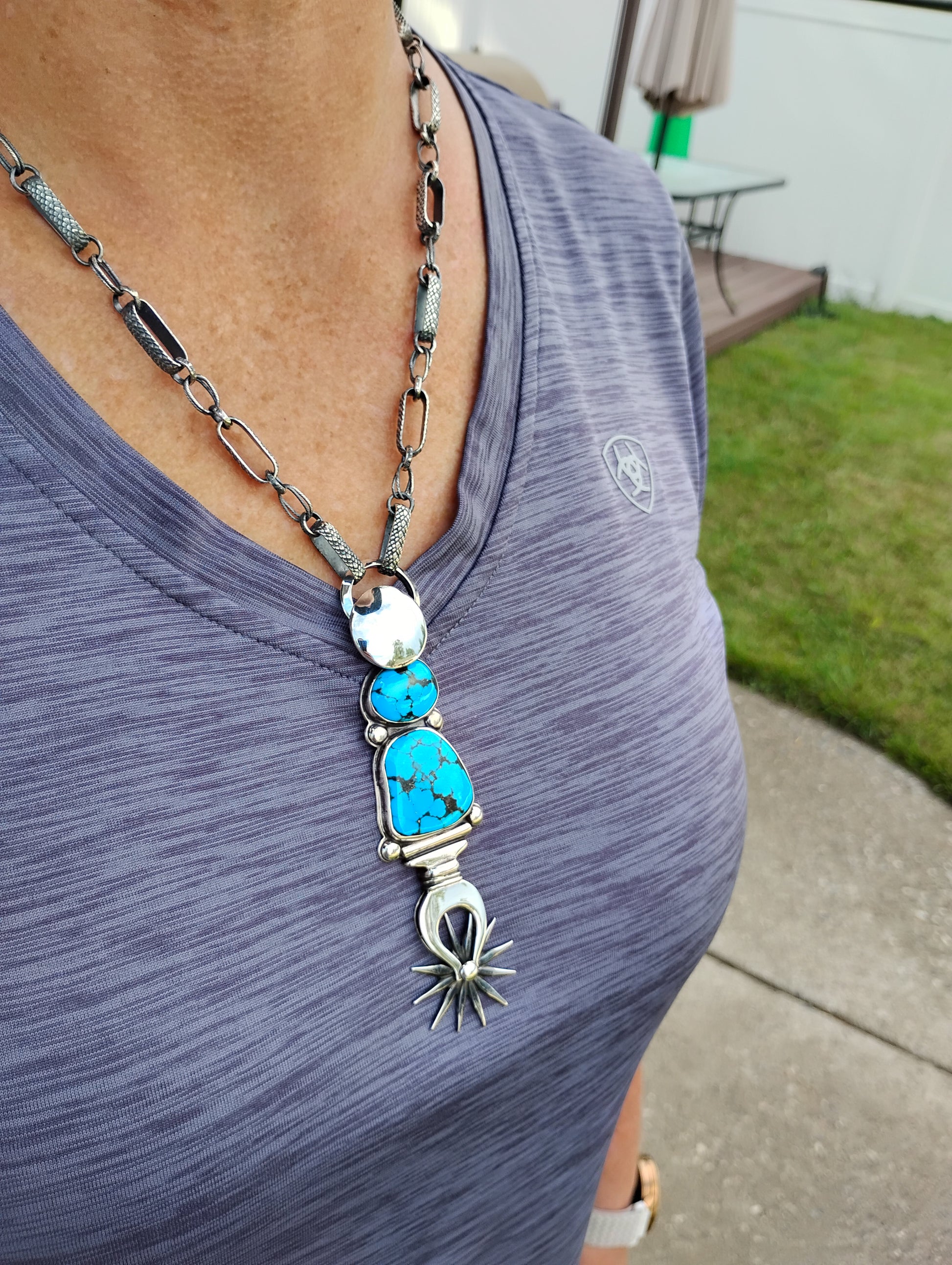 Crafted from sterling silver and adorned with vibrant Kingman turquoise and a handcrafted sterling silver chain, this pendant is a captivating piece that elevates any look with its bold, elegant charm. Drawn from the heritage of the classic California buckaroo, this piece captures timeless Western spirit with authentic style.