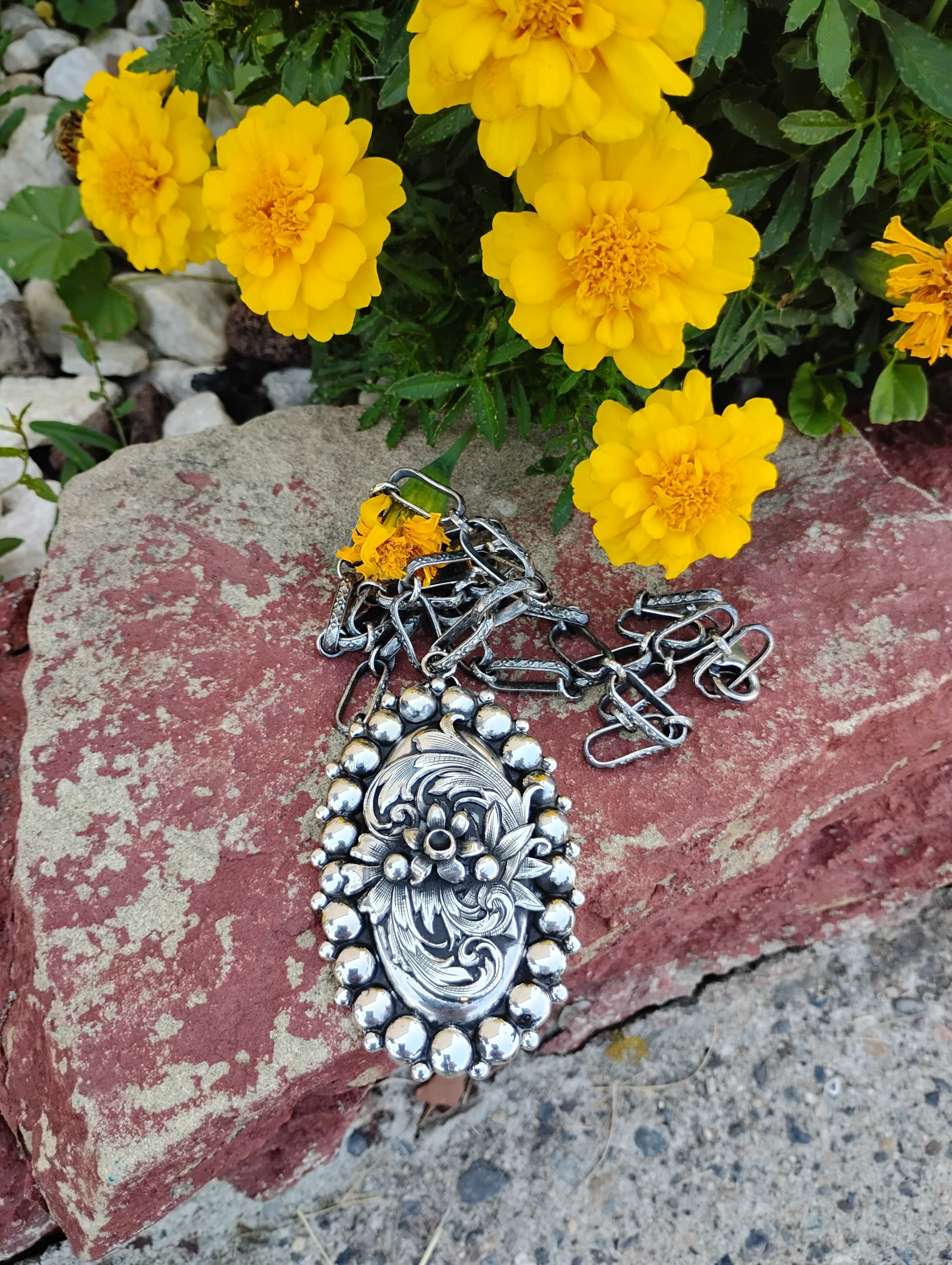 This necklace showcases a solid sterling silver oval pendant featuring intricate filigree overlay and detailed single-point engraving. Each piece is carefully handcrafted, creating a unique and beautifully crafted treasure perfect for someone special.