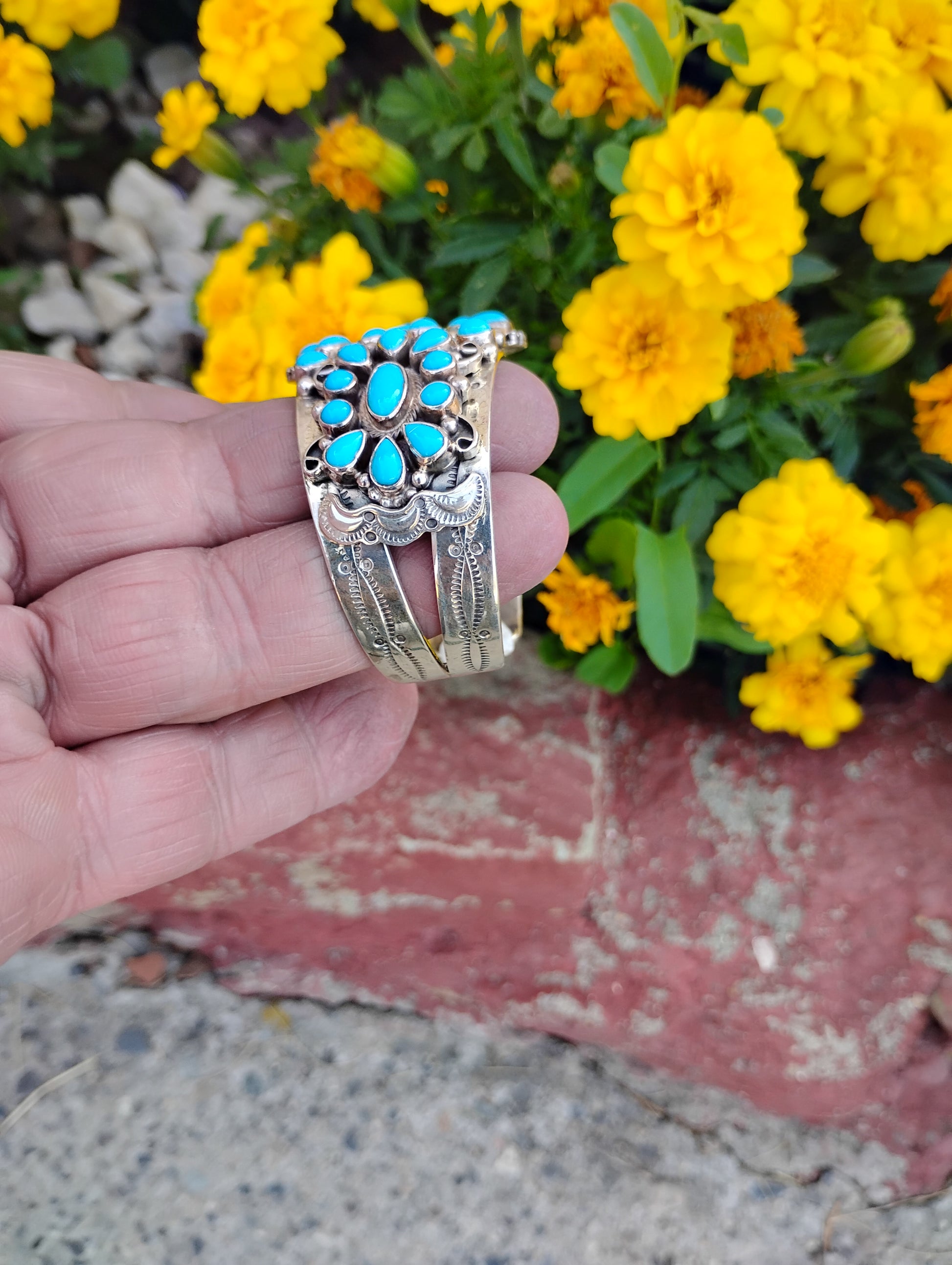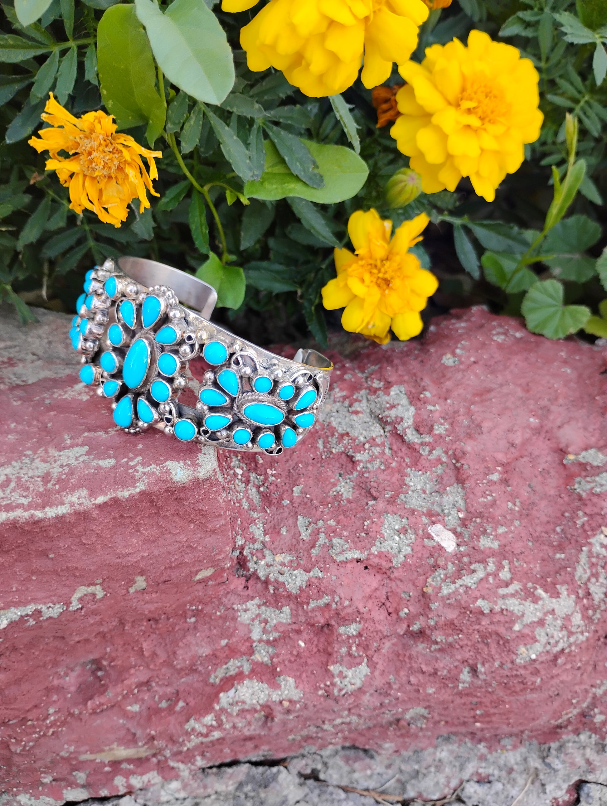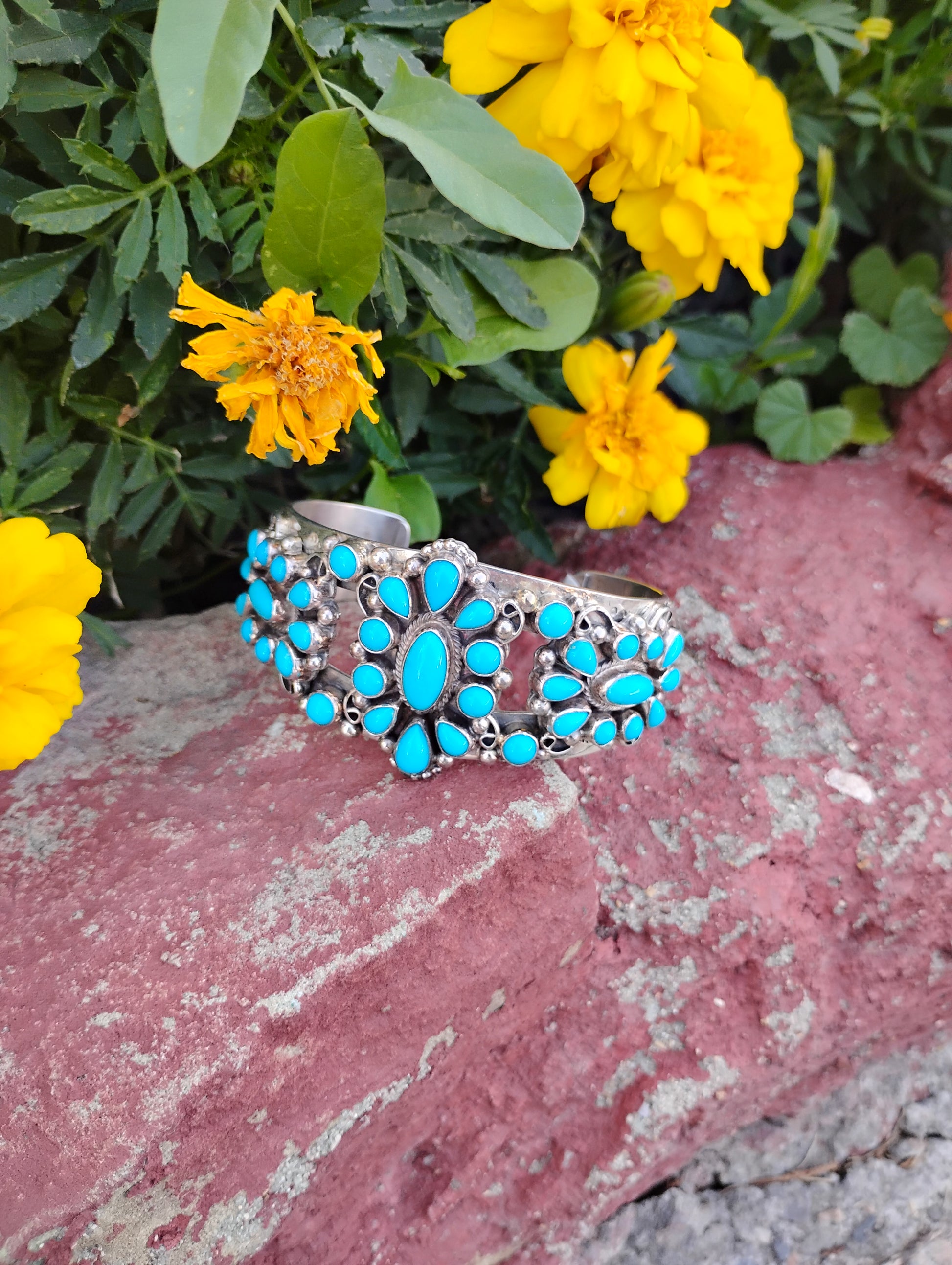 This striking sterling silver bracelet showcases several premium Sleeping Beauty turquoise stones, combining bold craftsmanship with lasting beauty.