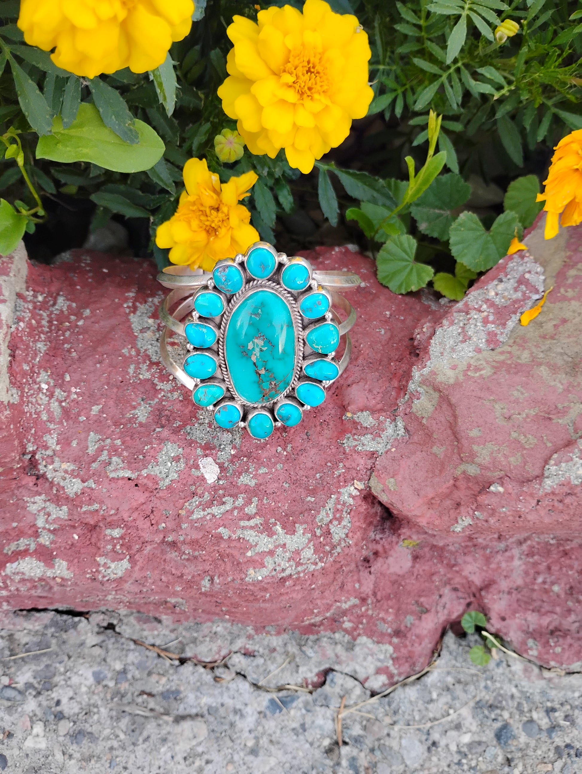 This striking sterling silver bracelet features vibrant Kingman turquoise and showcases authentic Navajo craftsmanship, making it a bold and timeless accessory.